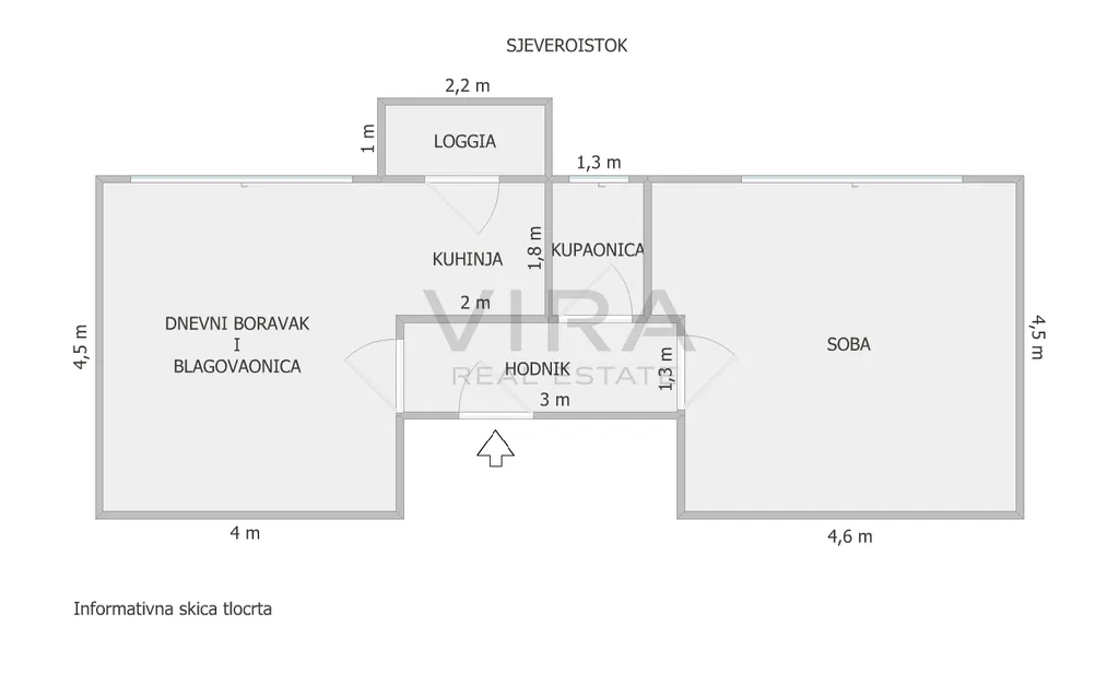 Stan se sastoji od dnevnog boravka, kuhinje, blagovaonice, spavaće sobe, hodnika, kupaonice i loggie.