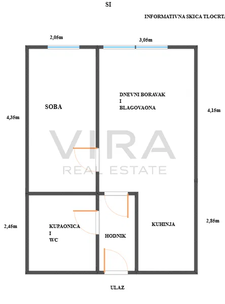 Stan se sastoji od dnevnog boravka, kuhinje i blagovaonice, 3 spavaće sobe, hodnika, izbe, kupaonice, wc-a te balkona.