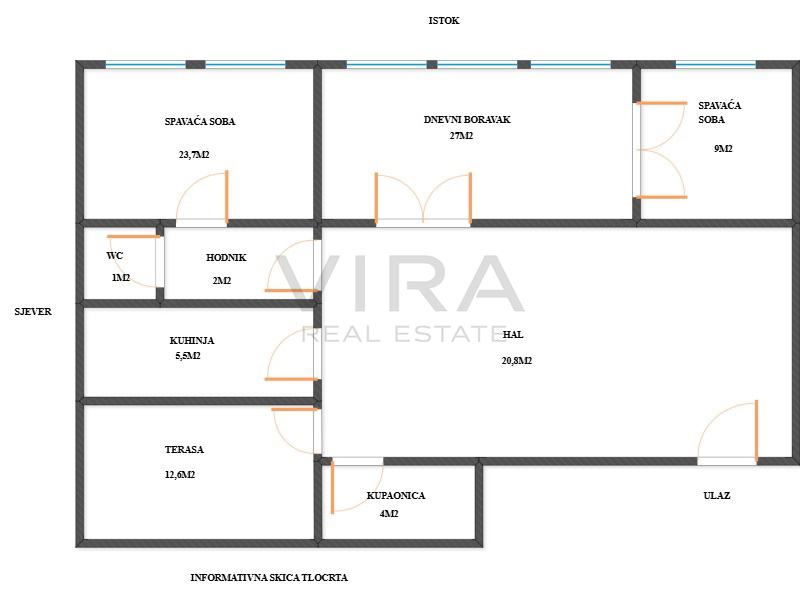 Stan se sastoji od dnevnog boravka, kuhinje, 2 spavaće sobe,hala, hodnika, kupaonice, wc-a i natkrivene terase.