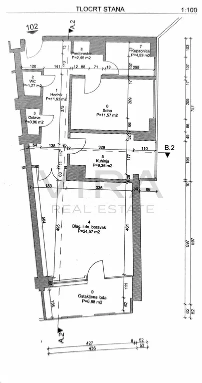 Stan se sastoji od dnevnog boravka, kuhinje i blagovaonice, spavaće sobe, hodnika, kupaonice, wc-a, izbe te zatvorene loggie.