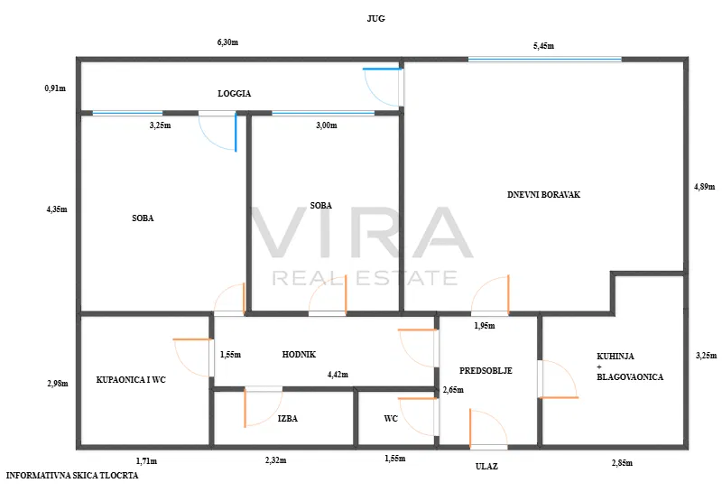 Stan se sastoji od dnevnog boravka, kuhinje i blagovaonice, 2 sobe, hodnika, predsoblja, izbe, kupaonice i wc-a, wc-a i loggie.