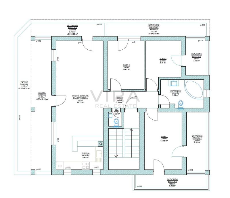 Stan se sastoji od dnevnog boravka i blagovaonice, kuhinje, 3 spavaće sobe, hodnika, wc-a, kupaonice s wc-om, loggie, 3 zatvorena balkona, 2 natkrivena balkona i terase.