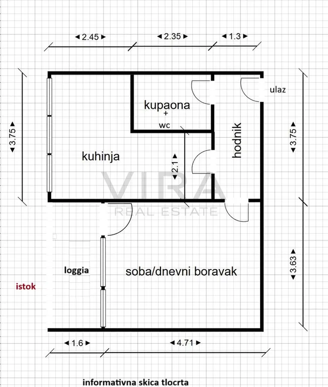 Stan se sastoji od sobe, kuhinje i blagovaonice, hodnika, kupaonice s wc-om i loggie.