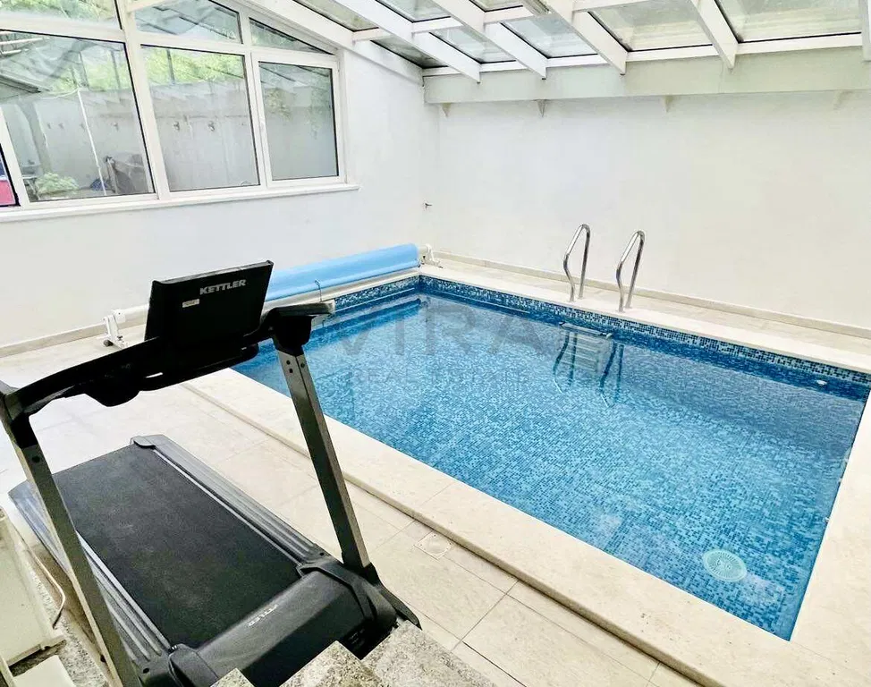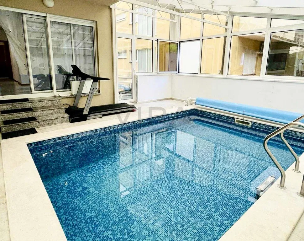 Stan se sastoji od dnevnog boravka, kuhinje s blagovaonicom, tri spavaće sobe, kupaonice s WC-om, zasebnim WC-om, hodnika, terase, loggie i zimskog vrta s bazenom.