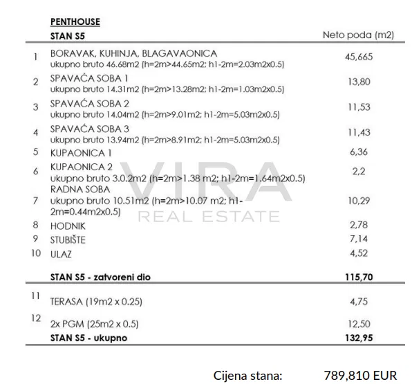 Stan se sastoji od dnevnog boravka, kuhinje i blagovaonice, 3 spavaće sobe, radne sobe, hodnika, 2 kupaonice s wc-om, ulaza, stubišta i terase.