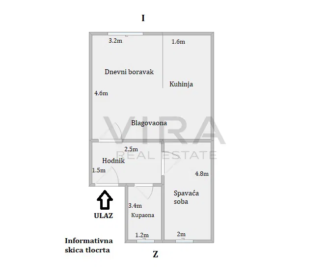 Stan se sastoji od dnevnog boravka s blagovaonicom i kuhinjom, spavaće sobe, kupaonice s wc-om te hodnika.
