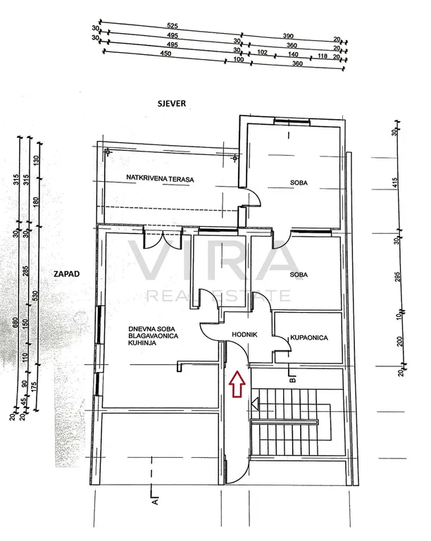 Stan se sastoji od dnevnog boravka i blagovaonice, kuhinje, 3 spavaće sobe, hodnika, kupaonice s wc-om i natkrivene terase.
