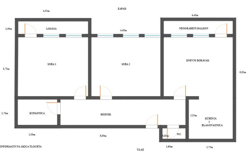 Stan se sastoji od dnevnog boravka, kuhinje, 2 spavaće sobe, hodnika, kupaonice, wc-a, loggie i neograđenog balkona.
