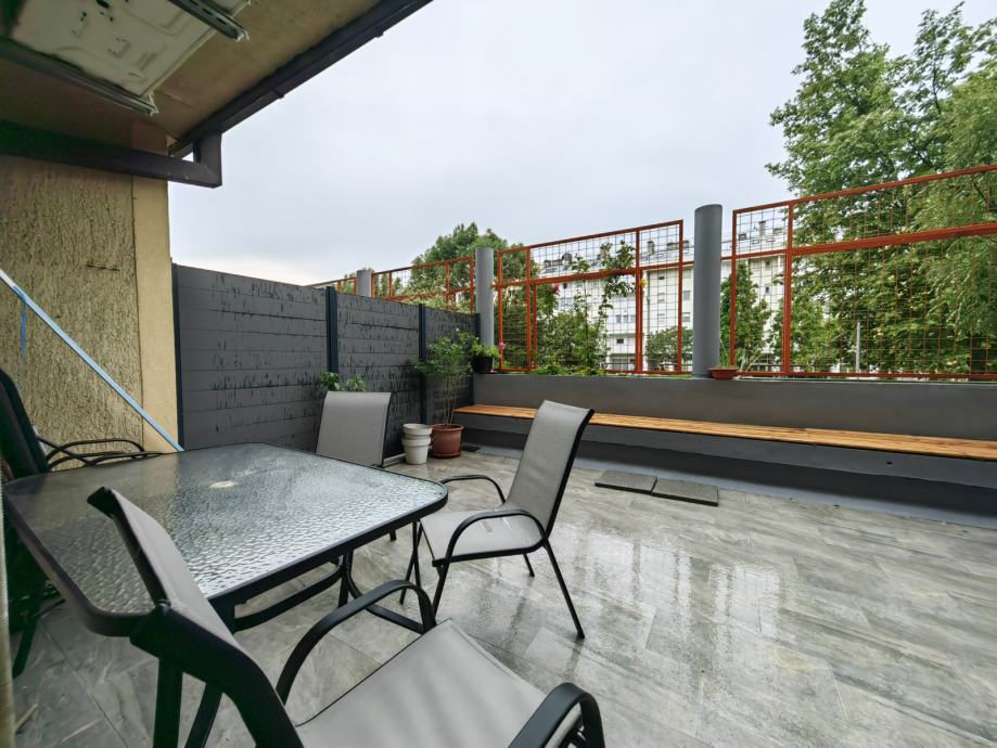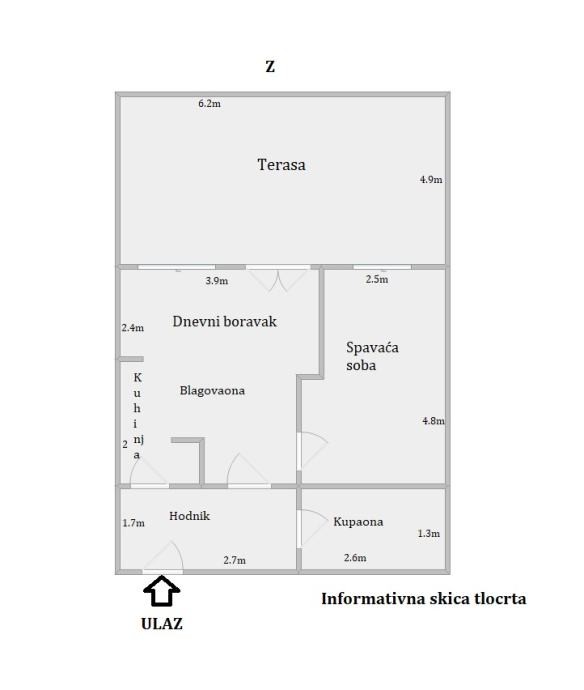 Stan se sastoji od dnevnog boravka s kuhinjom i blagovaonicom, spavaće sobe, kupaonice s wc-om, hodnika te velike terase.