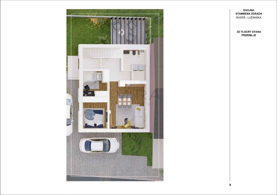 Stan se sastoji od dnevnog boravka s blagovaonicom, kuhinje, 2 spavaće sobe, kupaonice s wc-om, tehničke sobe ,spremišta te natkrivene terase.