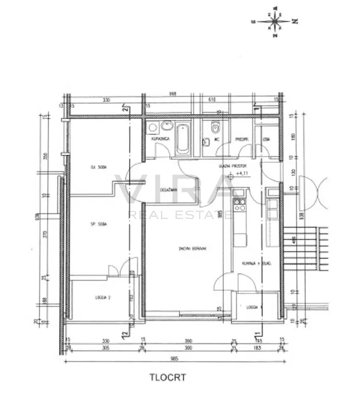Stan se sastoji od dnevnog boravka, kuhinje, blagovaonice, 2 spavaće sobe, 2 kupaonice s wc-om, loggie i hodnika.