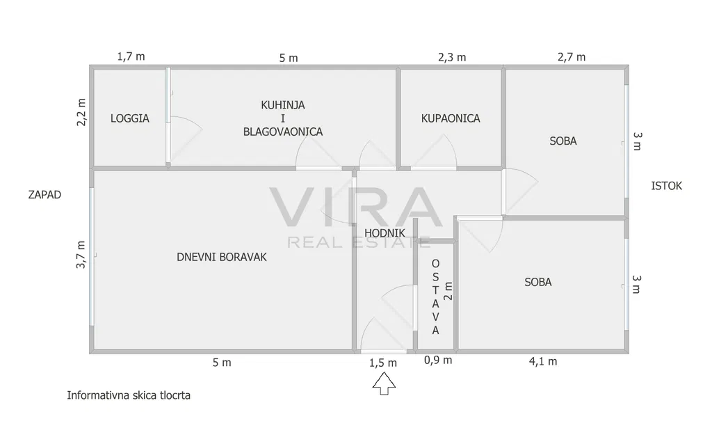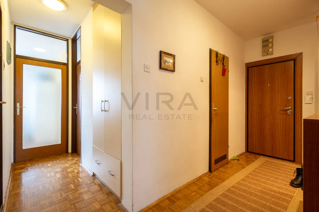 Stan se sastoji od dnevnog boravka, kuhinje s blagovaonicom, 2 spavaće sobe, kupaonice, hodnika, loggie i ostave.