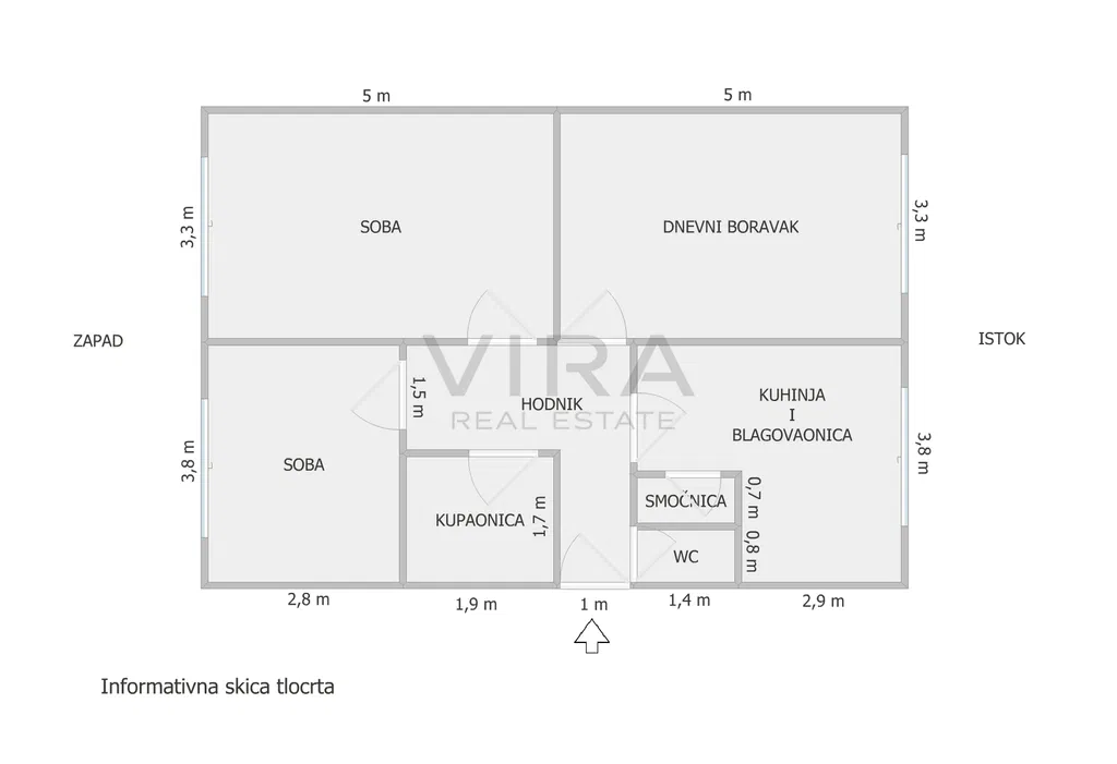 Stan se sastoji od dnevnog boravka, kuhinje i blagovaonice, 2 spavaće sobe, 2 hodnika, kupaonice, wc-a i smočnice.