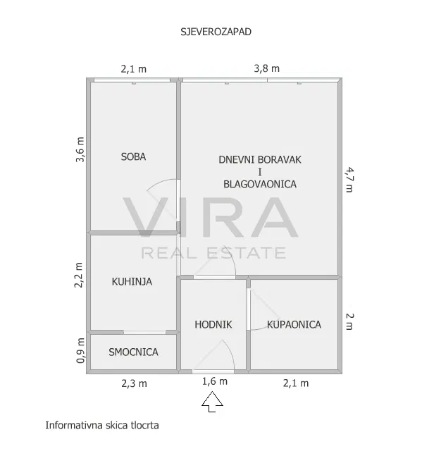 Stan se sastoji od dnevnog boravka s blagovaonicom, kuhinje, spavaće sobe, kupaonice i hodnika.