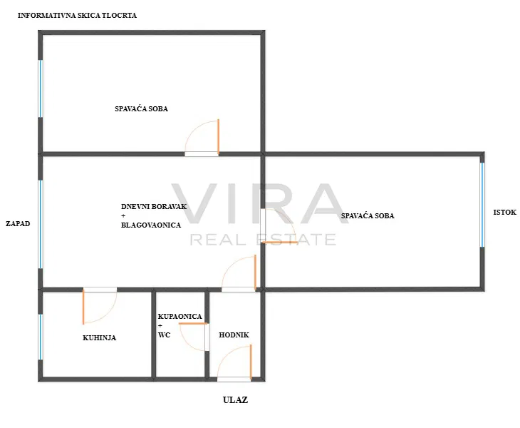 Stan se sastoji od dnevnog boravka i blagovaonice, kuhinje, 2 spavaće sobe, hodnika te kupaonice i wc-a.