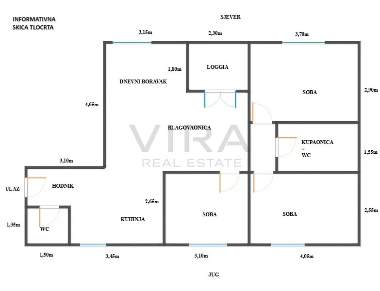 Stan se sastoji od open space dnevnog boravka i blagovaonice, kuhinje, 3 spavaće sobe, 2 hodnika, kupaonice s wc-om, wc-a te loggie.