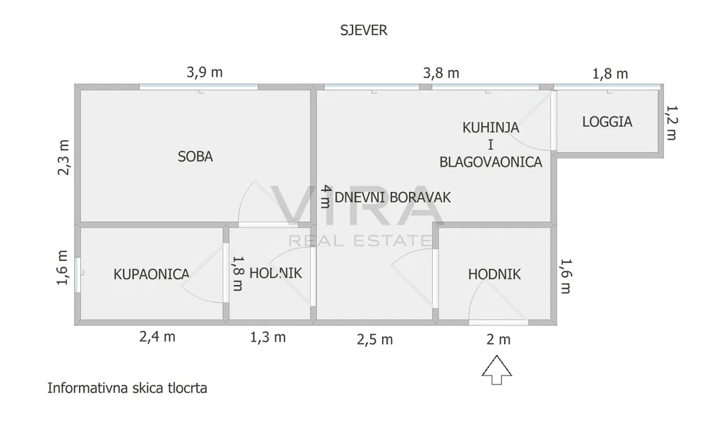 Stan se sastoji od dnevnog boravka, kuhinje, blagovaonice, spavaće sobe, kupaonice s wc-om, loggie i 2 hodnika.
